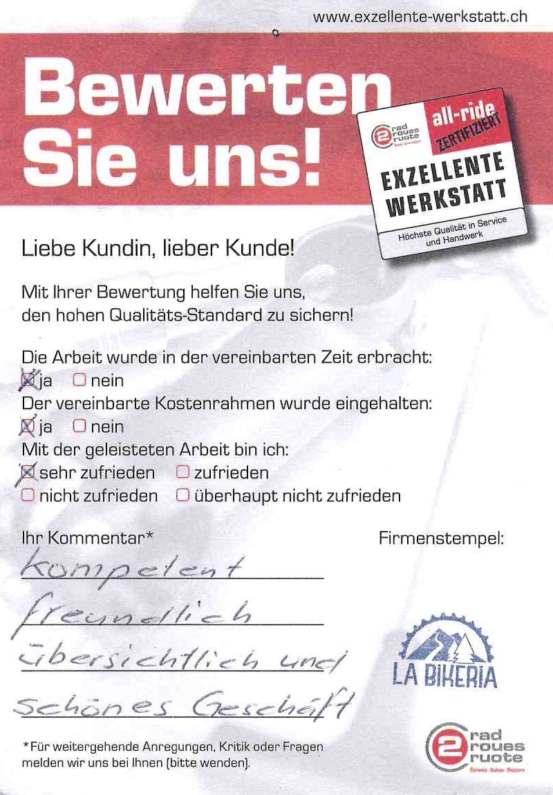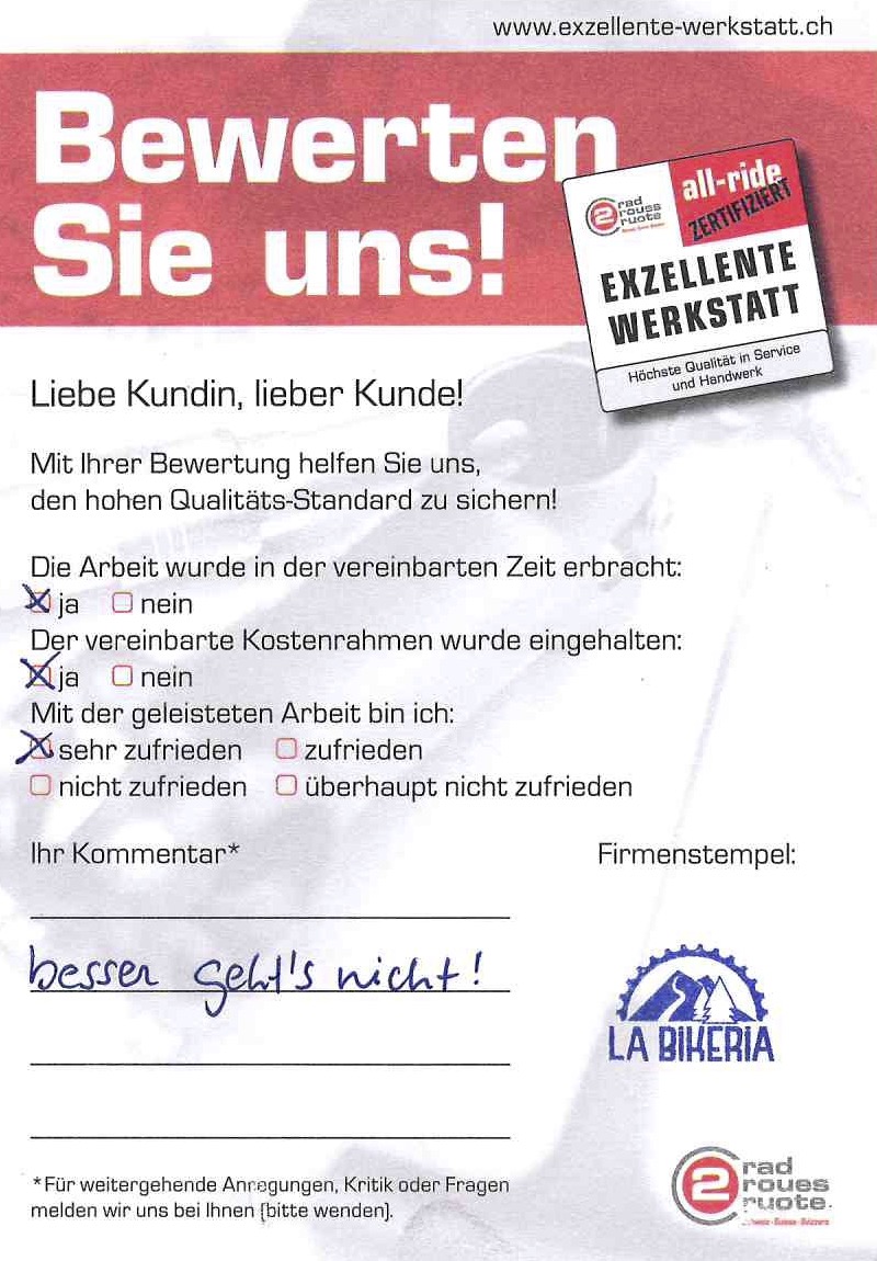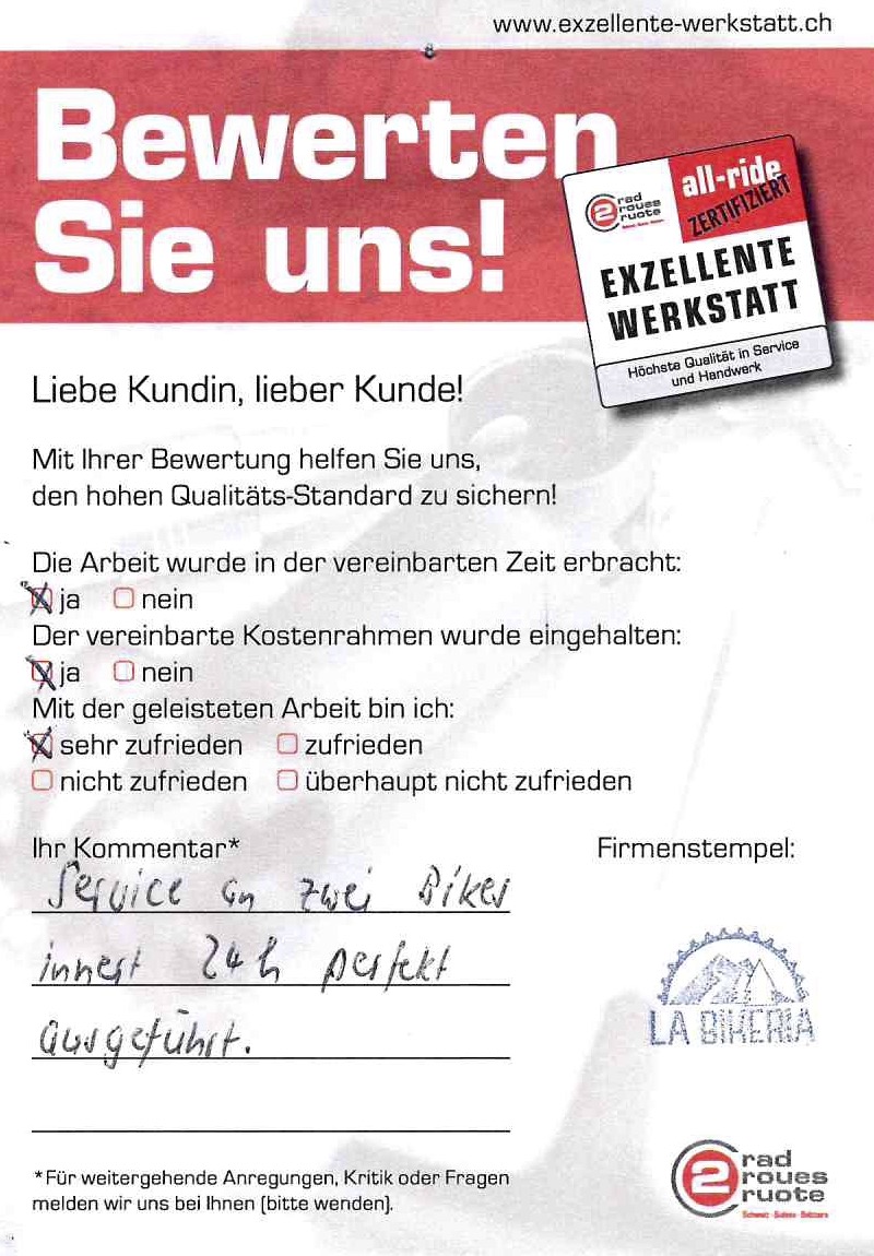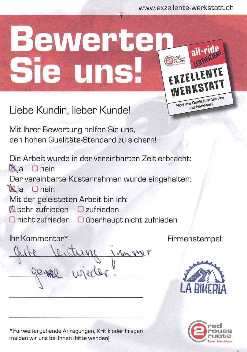 Als von 2 Rad Schweiz zertifizierte EXZELLENTE WERKSTATT stehen wir für höchste Qualität, Transparenz und Zuverlässigkeit. Von der Annahme deines Fahrrads bis zur Abholung arbeiten wir nach einem klar definierten und verbindlichen Kriterienkatalog des 2 Rad Verbands Schweiz.